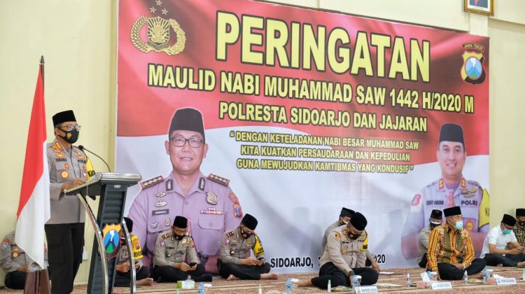 Sidoarjo – Upaya meneladani ajaran dan nilai-nilai perjuangan Nabi Muhammad SAW, Polresta Sidoarjo mengadakan acara peringatan Maulid Nabi Muhammad SAW, Kamis (29/10/2020), bertempat di Gedung Serbaguna Polresta Sidoarjo.