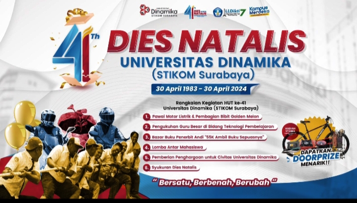 Surabaya| klikku.net – Dalam rangka memperingati HUT ke-41, Universitas Dinamika (STIKOM Surabaya) akan menyelenggarakan serangkaian acara Dies Natalis pada Selasa (30/4) mendatang.
