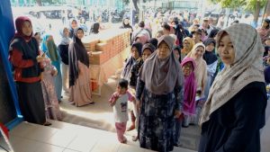 Warga antri paket sembako yang dibagikan SD Al Falah Surabaya