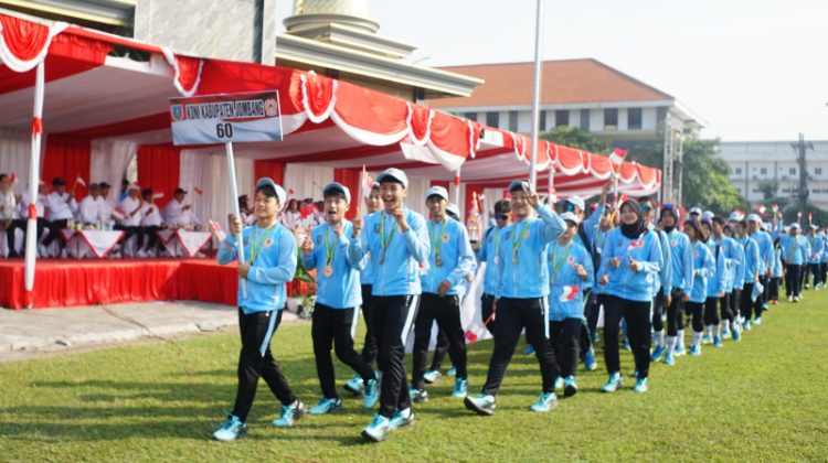 Di antara barisan itu, terlihat para atlet muda dari cabang atletik, pencak silat, panahan, hingga voli. Mereka melangkah dengan penuh percaya diri, mengenakan jaket olahraga berwarna biru, sambil membawa medali emas, perak, dan perunggu yang berhasil diraih dalam Porprov. Ada juga pelatih dan ofisial yang turut berjalan mendampingi, seolah ingin berkata, ini hasil kerja bersama.