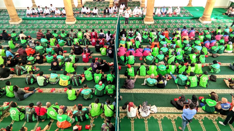 Pengemudi ojol tampak kompak mengenakan atribut hijau, sementara sebagian masyarakat hadir dalam balutan pakaian putih. Mereka duduk bersila, menundukkan kepala, larut dalam suasana haru.