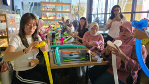 Suasana workshop pun berlangsung hangat. Suara balon yang diputar, sesekali disusul letusan kecil, justru memicu tawa peserta yang menikmati proses kreatif tersebut.